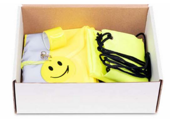 • set za otroke: varnostni telovnik, nahrbtna vreča, trak za roko, osevni obesek